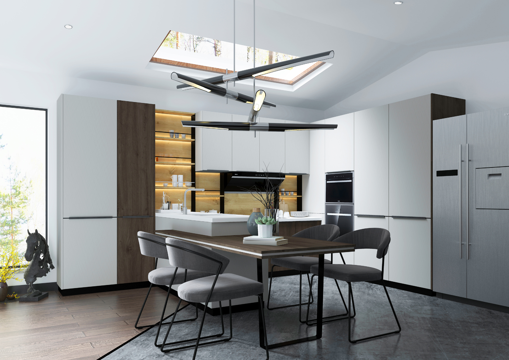 GoldenHome offers a variety of cabinet door panel options, including integrated panels, lacquer, thermofoil, and solid wood.
